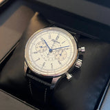 Diameter 41 mm. Stainless steel case. Silver dial with Arabic numerals. Blued hands. Sapphire crystal. Automatic chronograph movement. Caliber AL-860. 42-hour power reserve. Transparent case back. Non-original black leather replacement strap. Original Ardillon buckle with Alpina emblem.