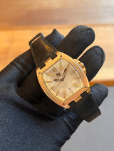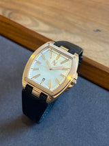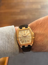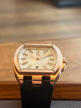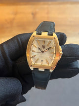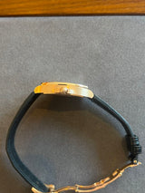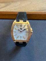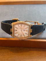 18-karat rose gold case. Quartz movement. Diameter 42mm * 37mm. Mother-of-pearl dial. Natural diamonds on the indexes. Black crocodile leather strap. Original 18-carat gold folding clasp. Solid caseback.