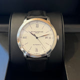 Diameter 42 mm. Stainless steel case. Smooth steel bezel. White dial with Roman numerals. Sapphire crystal. Automatic movement. Solid stainless steel case back with Baume & Mercier emblem. Black Baume & Mercier leather strap. Steel pin buckle with Baume & Mercier emblem.