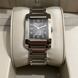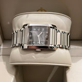 Dimensions 27 mm * 40 mm. Wrist size without additional links 16.9 cm. Stainless steel case and bracelet. Smooth steel bezel. Grey dial with Arabic numerals. Sapphire crystal. Quartz movement. Solid stainless steel case back with Baume & Mercier emblem. Double folding steel clasp.