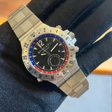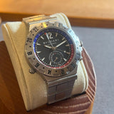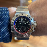 Diameter 40 mm. Thickness 12 mm. Stainless steel case and bracelet. Rotating bezel. Black dial with date counter at 6 o'clock, colored Pepsi second time zone scale. Luminescent hands and indexes. Sapphire crystal. Automatic movement. Caliber ETA 2892.42 hour power reserve. Full sighted caseback. Steel folding clasp.