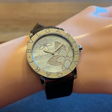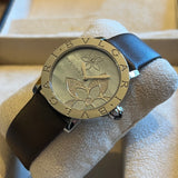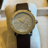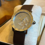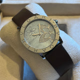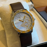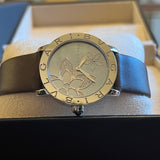 Diameter 37 mm. Stainless steel case. Steel bezel with Bulgari engraving. Mother of pearl dial with floral decorations and diamonds. Sapphire crystal. Automatic movement. Stainless steel case back with Bulgari emblem. Replacement brown leather strap, non-original. Stainless steel pin buckle with Bulgari emblem.