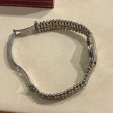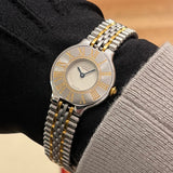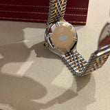 Diameter 28 mm. Wrist circumference 14.2 cm. Stainless steel case. Gold-plated steel bezel with Roman numerals. Ivory dial without numerals. Blued hands. Sapphire crystal. Quartz movement. Stainless steel and yellow gold bracelet. Original Cartier double folding clasp.