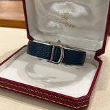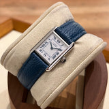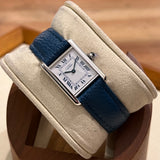 Diameter 20 mm * 27 mm. 925 silver case. Smooth 925 silver bezel. White dial with Roman numerals. Blued hands. Sapphire crystal. Quartz movement. Solid silver case back with Cartier emblem. Replacement blue leather strap, not original Cartier. Original Cartier folding clasp.