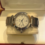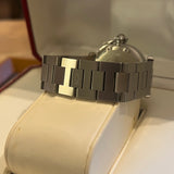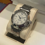 Diameter 35 mm. Wrist circumference 14.8 cm. Stainless steel case and bracelet. Smooth steel bezel. White dial with Arabic numerals. Luminous hands and markers. Sapphire crystal. Automatic movement. Solid steel case back with Cartier emblem. Double folding clasp in steel with Cartier emblem.