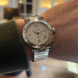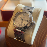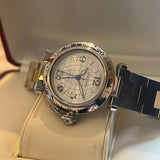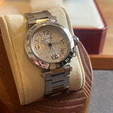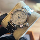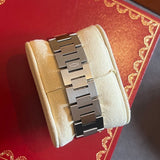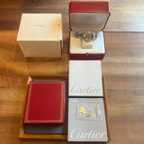 Diameter 35 mm. Waterproof 30 meters. Stainless steel case and bracelet. Automatic movement. Silver dial with Arabic numerals. Sapphire crystal. Original Cartier double folding clasp. Solid caseback. Luminescent hands and points. Fixed steel bezel.