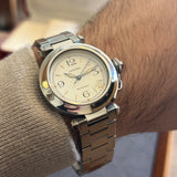 Diameter 35 mm. Wrist size 14 cm without the 4 extra links. Stainless steel case and bracelet. Smooth stainless steel bezel. Cartier crown. White dial with Arabic numerals. Blued hands. Sapphire crystal. Automatic movement. Solid stainless steel case back with Cartier emblem. Stainless steel double folding clasp with Cartier emblem.