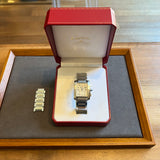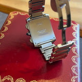 Diameter 28 mm * 37mm. Wrist circumference without additional links: 14.2 cm. Case and bracelet in stainless steel. Smooth steel bezel. Crown with Cartier blue cabochon. Silvered dial with Roman numerals. Blued hands. Sapphire crystal. Quartz movement. Solid steel case back with Cartier emblem. Original Cartier double folding steel clasp.