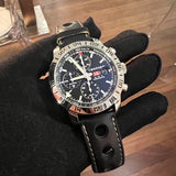 Diamètre 42 mm. Épaisseur 17 mm. Étanche 50 mètres. Boîtier et lunette en acier inoxydable. Bracelet d’origine en cuir noir avec surpiqûres blanches. Boucle de fermoir d’origine.