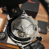 Contenu Full Set : montre, boîte, sur-boîte, certificat d’origine, certificat chronométrique, manuels, jauge de pression Chopard.