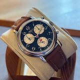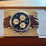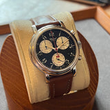 Diameter 38 mm. Stainless steel case. Quartz movement. Sapphire crystal. Black dial with Arabic numerals. Luminescent hands. Solid caseback. Chopard brown leather bracelet. Chopard pin buckle in steel.