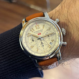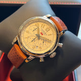 Diameter 42 mm. Stainless steel case. Smooth steel bezel. White dial with Arabic numerals. Luminous hands. Sapphire crystal. Automatic movement. Transparent case back. Brown leather and black rubber Chopard strap. Steel pin buckle with Chopard emblem.