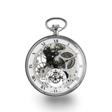 Without cover, rhodium-plated case, manual winding, skeleton, small seconds at 6 o'clock, white Roman numerals.