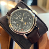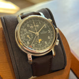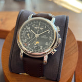Functions: Hours, minutes, chronograph, moon phase at 6 o’clock, day and month display at 12 o’clock, date display.