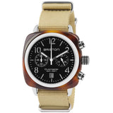 Clubmaster Classic chronograph watch, 40 mm. Stainless polished steel case and tortoiseshell acetate. Black dial. Chronograph, date, 2 counters. 60-minute counter at 9 o'clock, 24-hour counter at 3 o'clock. Hands with white Superluminova® luminescent inserts. Cambered mineral glass. Exclusive Briston interchangeable strap: khaki with steel buckles. Miyota OS21 quartz calibre.