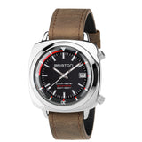 HMS Clubmaster Diver automatic watch, 42 mm. Polished 316L stainless steel case. Black dial. Hours, minutes, seconds and date window. Inner bidirectional bezel to check immersion times. Baton hands with white Superluminova® C1 luminescent inserts. Curved ultra-resistant K1 glass. Water-resistant to 200m / 20 ATM. Exclusive Briston strap in brown vintage leather. Interchangeable without tools. Automatic NH35A calibre manufactured by Seiko.