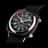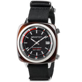 HMS Clubmaster Diver automatic watch, 42 mm. Stainless steel and tortoiseshell acetate case. Black dial. Hours, minutes, seconds and date window. Inner bidirectional bezel to check immersion time. Baton hands with white Superluminova® C1 luminescent inserts. Curved ultra-resistant K1 glass. Water-resistant to 200m / 20 ATM. Exclusive Briston NATO strap in black nylon. Interchangeable without tools. Automatic NH35A calibre manufactured by Seiko.