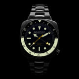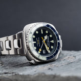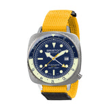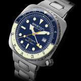 Clubmaster Diver Pro GMT automatic watch, 44 mm. Fully brushed 316L stainless steel case. Navy blue dial with gloss finish. Hours, minutes, centre seconds, GMT and date window at 3 o'clock. Unidirectional rotating notched sapphire bezel with AM/PM indication in natural Superluminova® Polished steel "arrow" hands with natural Superluminova® inserts. Ultra-resistant sapphire crystal - 3.3 mm thick. Screw-down crown engraved in polished steel at 4 o'clock. Water-resistant to 300m / 30 ATM. Exclusive Briston interchangeable bracelet in brushed steel with mirror-polished links. Second yellow Velcro® strap. Swiss automatic movement calibre SW330-1.
