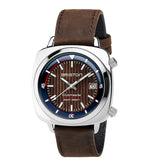 HMS Clubmaster Diver automatic watch, 42 mm. Polished 316L stainless steel case. Navy blue and genuine walnut dial. Hours, minutes, seconds and date window. Inner bidirectional bezel to check immersion times. Baton hands with white Superluminova® C1 luminescent inserts. Curved ultra-resistant K1 glass. Water-resistant to 200m / 20 ATM. Exclusive Briston strap in brown vintage leather. Interchangeable without tools. Automatic NH35A calibre manufactured by Seiko.