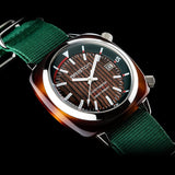 HMS Clubmaster Diver automatic watch, 42 mm. Stainless steel and tortoiseshell acetate case. British green and genuine walnut dial. Hours, minutes, seconds and date window. Inner bidirectional bezel to check immersion time. Baton hands with white Superluminova® C1 luminescent inserts. Curved ultra-resistant K1 glass. Water-resistant to 200m / 20 ATM. Exclusive Briston NATO strap in British green nylon. Interchangeable without tools. Automatic NH35A calibre manufactured by Seiko.