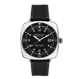 HMS automatic Clubmaster Legend Diver watch, 40 mm. Fully mirror-polished 316L stainless steel case. Black dial. Hours, Minutes, Centre seconds and Date. Unidirectional rotating sapphire bezel with Superluminova® C3 indicatins and bars. Hands with Superluminova® C3 luminescent inserts. Ultra-resistant sapphire crystal. Water-resistant to 200m / 20 ATM. Exclusive matt black FKM vulcanized rubber strap. Miyota 8315 automatic movement.