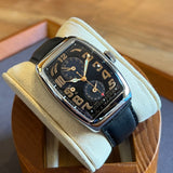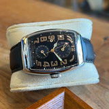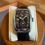 Diameter 44 x 33 mm. Thickness 11.5 mm. Stainless steel case. Smooth steel bezel. Black dial with Arabic numerals. Luminous hands and tips. Sapphire crystal. Automatic GMT movement. Caliber ETA 2892-A2. Solid stainless-steel case back with Dubey & Schaldenbrand emblem. Replacement off-brand black leather strap. Steel pin buckle with Dubey & Schaldenbrand emblem.