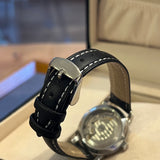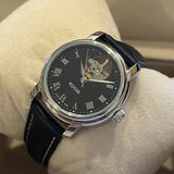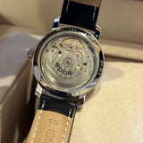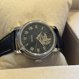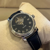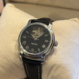 Diameter 32 mm. Stainless steel case. Smooth steel bezel. Black dial with Roman numerals. Sapphire crystal. Automatic movement. Transparent case back. Replacement off-brand black leather strap. Epos pin buckle.