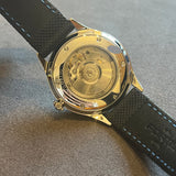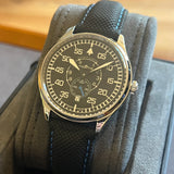 Diameter 41 mm. Stainless steel case. Smooth steel bezel. Black dial with Arabic numerals. Luminous hands. Sapphire crystal. Automatic movement. Transparent case back. Original Fortis black nylon strap. Steel pin buckle with Fortis emblem.