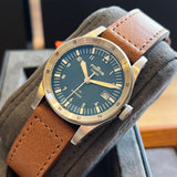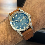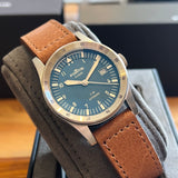 Diameter 39 mm. Stainless steel case. Graduated steel bezel. Blue dial with Arabic numerals. Luminous hands and indexes. Sapphire crystal. Automatic movement. Solid stainless steel case back with sticker and Fortis emblem. Brown Fortis leather strap. Fortis pin buckle.