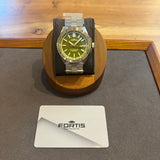 Diameter 40 mm. Wrist size 22.5 cm. Case and bracelet in stainless steel. Graduated steel bezel. Green dial without numerals. Luminous hands and indexes. Sapphire crystal. Automatic movement. Solid steel case back with Fortis emblem. Steel deployant clasp with Fortis emblem.