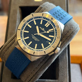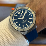 Diameter 44 mm. Stainless steel case. Graduated stainless steel bezel. Blue dial without numerals. Luminous hands and indexes. Sapphire crystal. Automatic movement. Solid stainless steel case back with sticker and Fortis emblem. Blue Fortis rubber strap. Stainless steel folding clasp with Fortis emblem.