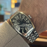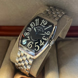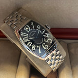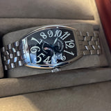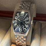 Diameter 32mm*45mm. Case and bracelet in stainless steel. Smooth stainless steel bezel. Black dial with Arabic numerals. Blued hands. Sapphire crystal. Automatic movement. Solid stainless steel case back. Stainless steel double folding clasp with Franck Muller emblem.