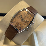 Diameter 32 mm* 44 mm. Case in 18Kt white gold. Smooth bezel in 18Kt white gold. Salmon dial with Arabic numerals. Luminous hands. Sapphire crystal. Automatic movement. Case back in 18Kt white gold with Franck Muller emblem. Brown leather off-brand strap. Franck Muller pin buckle.