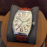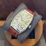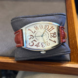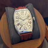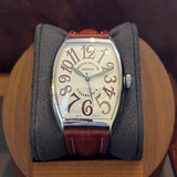 Diameter 34 mm * 47 mm. Stainless steel case. Smooth steel bezel. Franck Muller crown. White dial with Arabic numerals. Blued hands. Sapphire crystal. Automatic movement. Solid steel case back with Franck Muller emblem. Brown Hirsch leather strap. Franck Muller pin buckle.