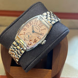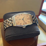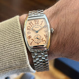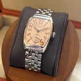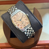 Diameter 29 mm * 39 mm. Wrist size 18.9 cm. Case and bracelet in stainless steel. Smooth steel bezel. Franck Muller crown. Salmon dial with Arabic numerals. Blued hands. Sapphire crystal. Mechanical movement. Solid steel case back with Franck Muller emblem. Double folding clasp in steel with Franck Muller emblem.