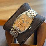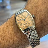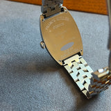 Diameter 29 mm * 47 mm. Wrist size without the extra links: 14.3 cm. Case and bracelet in stainless steel. Smooth steel bezel. Salmon dial with Arabic numerals. Blued hands. Sapphire crystal. Mechanical movement. Solid steel case back with Franck Muller emblem. Franck Muller double folding clasp.