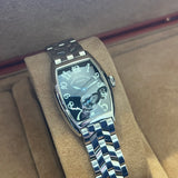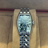 Diameter 24 mm* 34 mm. Wrist circumference without additional links: 14.5 cm. Stainless steel case and bracelet. Smooth steel bezel. Franck Muller crown. Black dial with Arabic numerals. Blued hands. Sapphire crystal. Mechanical movement. Solid stainless steel case back with Franck Muller emblem. Double folding clasp in steel.
