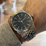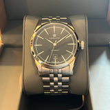 Diameter 42 mm. Thickness 11.4 mm. Stainless steel case and bracelet. Smooth steel bezel. Black dial without numerals. Sapphire crystal. Automatic movement. Caliber H-10. Power reserve 80 hours. Transparent case back. Double folding clasp with Hamilton emblem.