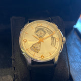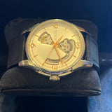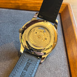 Diameter 40 mm. Stainless steel case. Smooth steel bezel. Silver dial with Arabic numerals. Gold hands and indexes. Sapphire crystal. Automatic movement. Transparent case back. Replacement black leather strap off-brand. Hamilton steel pin buckle.