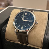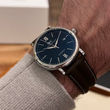 Functions: Hours, minutes, central seconds with stop device, date display at 3 o'clock.