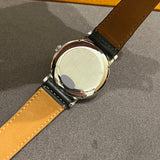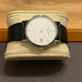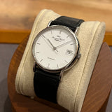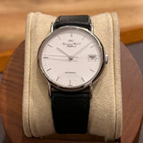 Diameter 34 mm. Thickness 8.10 mm. Stainless steel case. Smooth steel bezel. White dial without numerals. Sapphire crystal. Automatic movement. Caliber 37521. Solid steel case back. Replacement black leather strap, not original. Replacement steel pin buckle, not original.