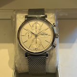 Diameter 42 mm. Thickness 13.6 mm. Stainless steel case and bracelet. Smooth steel bezel. Silver dial without numerals. Sapphire crystal. Automatic chronograph movement. Caliber 75320. 44-hour power reserve. Solid steel case back with IWC emblem. Deployant clasp with original sticker and IWC emblem.