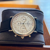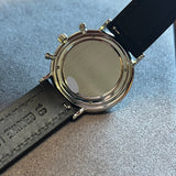 Diameter 35 mm. Stainless steel case. Smooth steel bezel. White dial without numerals. Luminous hands. Sapphire crystal. Quartz movement. Solid stainless steel case back. Replacement black leather strap off-brand. Steel pin buckle with IWC emblem.