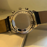 Diameter 41 mm. Stainless steel case. Smooth steel bezel. Silver dial with Arabic numerals. Blued numerals and hands. Automatic chronograph movement. Solid case back with IWC emblem. Non-original black leather replacement strap. Pin buckle with IWC emblem.