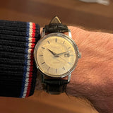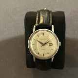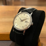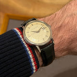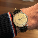Watch guaranteed for 12 months and authenticated by our team. Watch in good condition. Stains on the dial. New non-original black leather strap. Non-original clasp buckle.