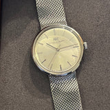 Diameter 34 mm. Wrist circumference of 19.5 cm. Case and bracelet in stainless steel. Smooth steel bezel. Silver dial without numerals. Mechanical movement. Solid steel case back. Steel folding clasp with IWC emblem.
