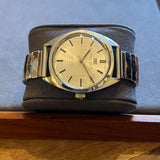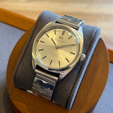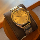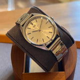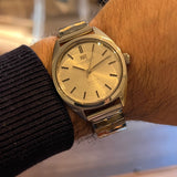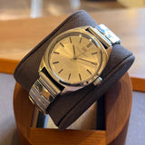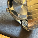 Diameter 36 mm. Wrist circumference of 16.3 cm. Stainless steel case. Smooth steel bezel. Silver dial without numerals. Plexiglass crystal. Automatic movement. Solid steel case back. Replacement steel bracelet, not original. A leather strap of your choice can be offered upon request.