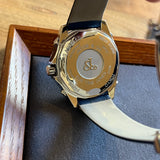 Diameter 40 mm. Stainless steel case. Smooth stainless steel bezel. Silver guilloché dial with Arabic numerals. Sapphire crystal. Quartz movement. Solid stainless steel case back with Jacob & Co emblem. Black replacement leather strap off-brand. Stainless steel deployant clasp with Jacob & Co emblem.
