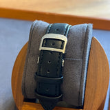 Diameter 29 mm * 47 mm. Stainless steel case. Smooth steel bezel. Jaeger-LeCoultre crown. Silver dial with Arabic numerals. Blued hands. Sapphire crystal. Mechanical movement. Caliber 875. Transparent caseback. Black leather replacement off-brand strap. Stainless steel double folding clasp with Jaeger-LeCoultre emblem.
