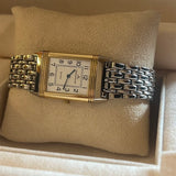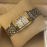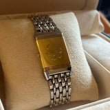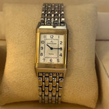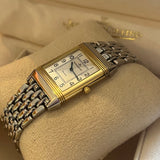 Diameter 23mm * 38mm. Case in steel and 18kt yellow gold. Jaeger-LeCoultre steel bracelet with double folding clasp. Silver dial with Arabic numerals. Engraving on the case back.
